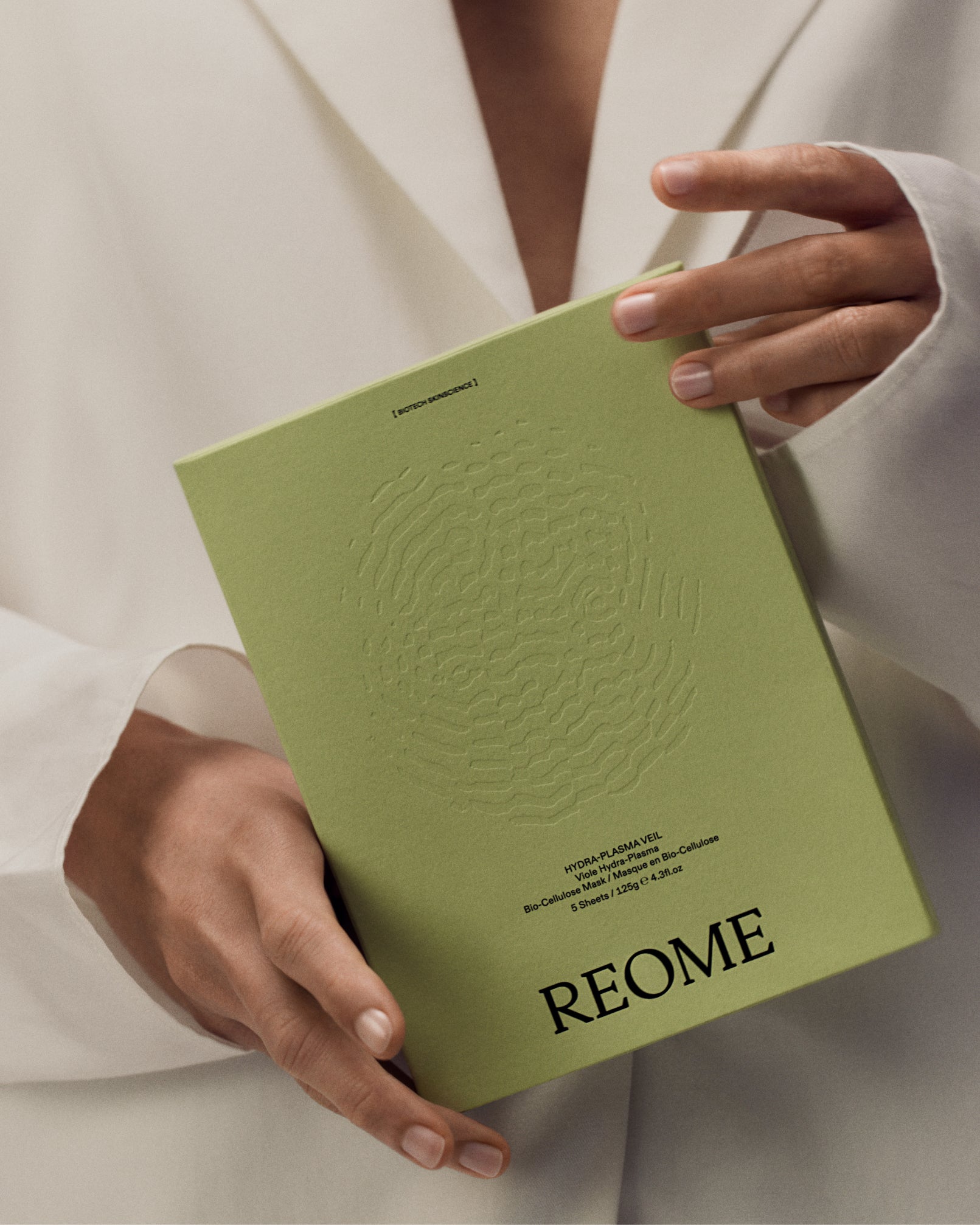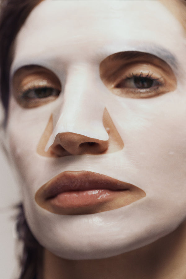 Made from 100% fermented coconut, each veil is cultivated over 10–15 days into a nano-fibre network that adheres like a second skin. The material actively cools, enhances ingredient delivery, and is biodegradable.
